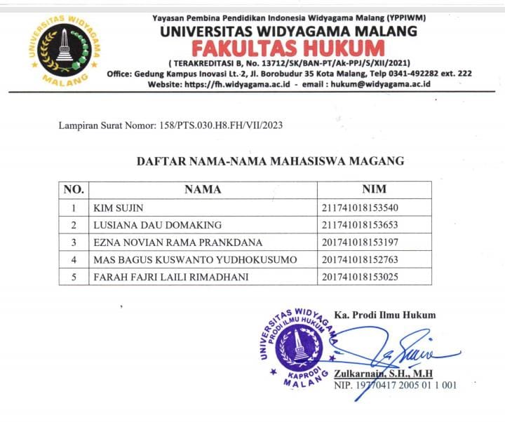 Berikut daftar 5 Mahasiswa/Mahasiswi Universitas Widyagama Malang yang lolos pada Program Magang di Mahkamah Agung RI :