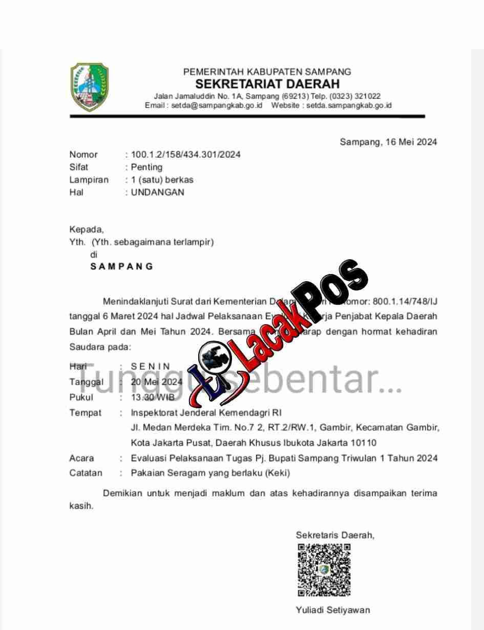 SAMPANG – LACAKPOS-CO.ID – Untuk memenuhi ketentuan pasal 18, 19, 20 dan pasal 21 Permendagri Nomor 4 Tahun 2023, kini Pj. Bupati Sampang dipanggil Tim Itjen Kemendagri RI, Jl. Medan Merdekat Timur, Gambir-di Jakarta Pusat.