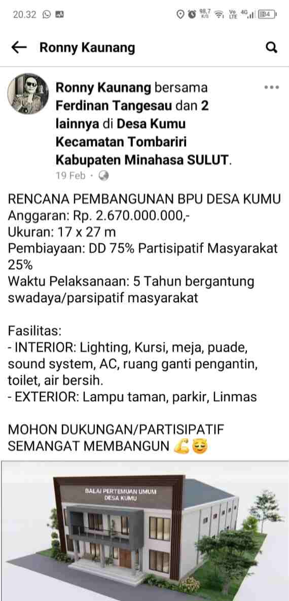 Dikutip dari unggahan fb Ronny Kaunag pada (19 Februaru 2024) ia menulis, Rencana Pembangunan BPU Desa Kumu. Anggaran: Rp. 2.670.000.000,-