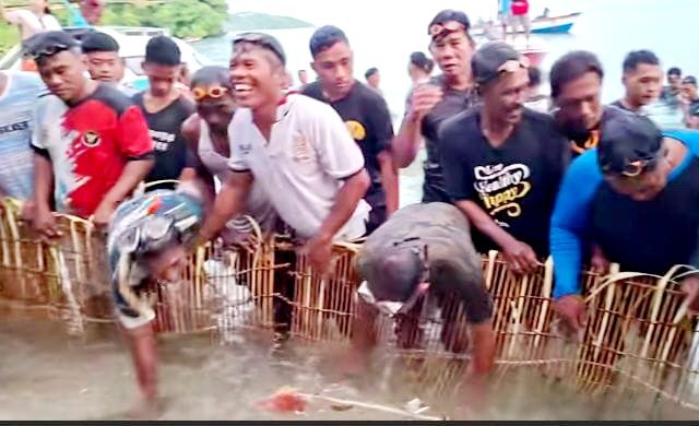 Salah satu tokoh adat setempat, menuturkan dengan semangat, “Dari jam tiga pagi, masyarakat sudah mulai bersiap. Menjelang matahari terbit, kita bisa melihat jaring bambunya memanjang sampai ke darat. Di situlah keajaiban terjadi—ikan-ikan bermunculan dari laut seperti ikut dalam perayaan.”