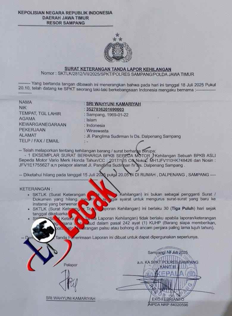 “Alhamdulillah saat ini sudah selesai dan pelayanannya luar biasa dan emang jozz, yang dibutuhkan berupa Surat Keterangan Tanda Lapor Kehilangan (SKTLK) dengan Nomor : SKTLK/2812/VII/2025/SPKT/POLRES SAMPANG/POLDA JAWA TIMUR ditangan”, ungkapnya penuh suka cita di saat kehilangan dokumen penting miliknya