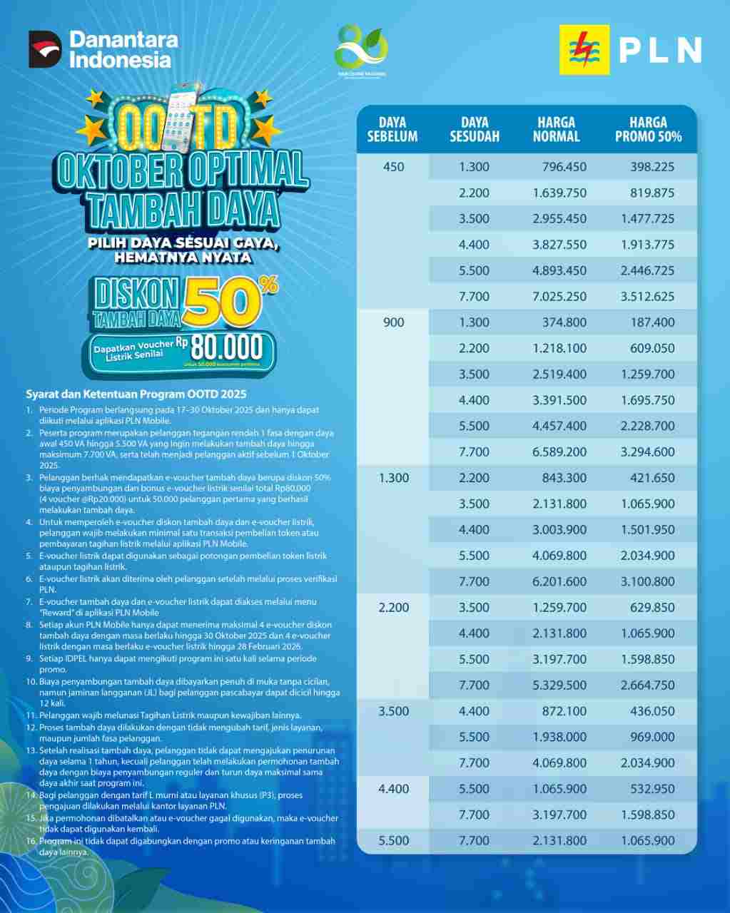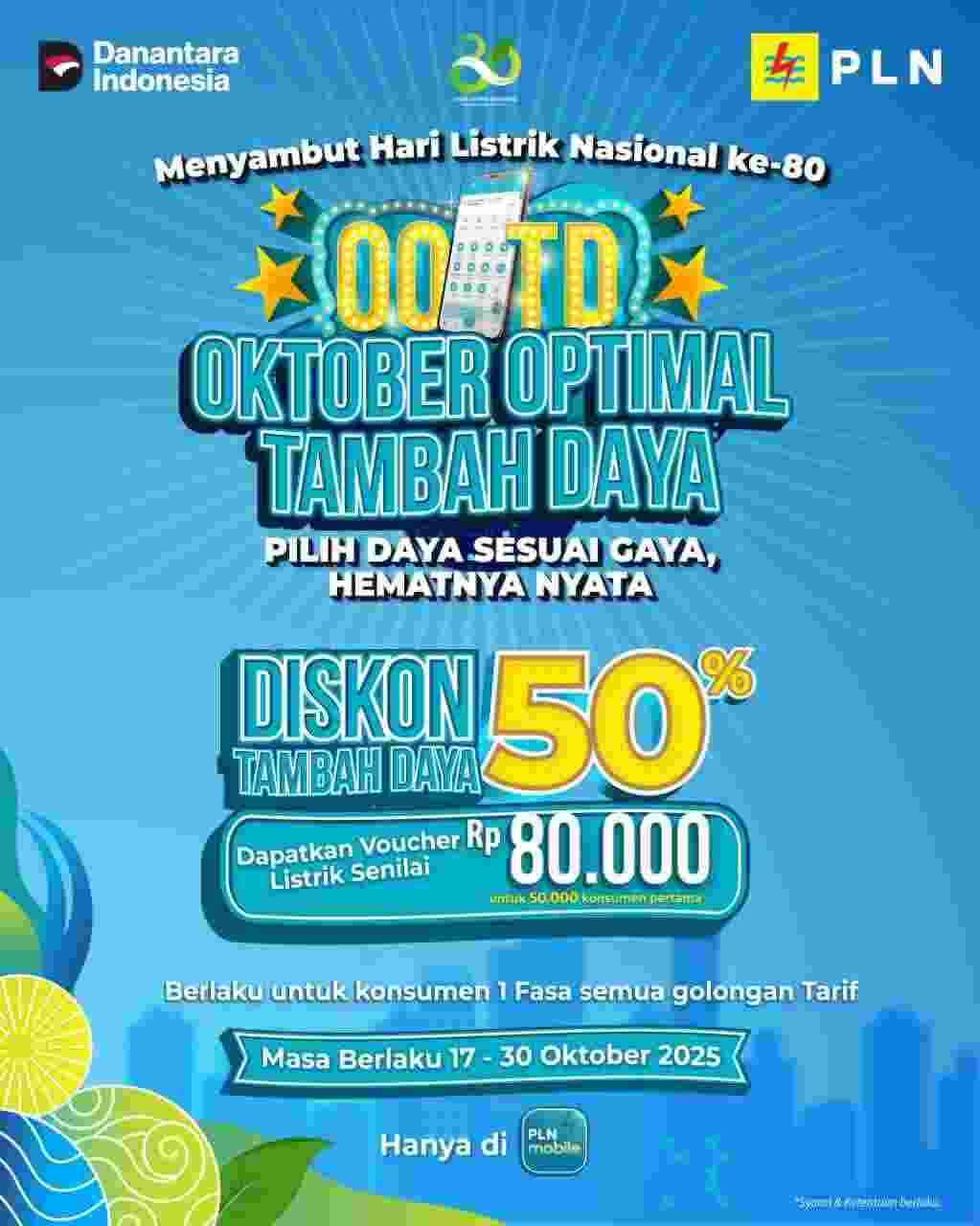 Menyambut Hari Listrik Nasional ke-80 PLN Sangihe sampaikan ayo bulan Oktober optimal tambah daya, pilih daya sesuai gaya, hemat nyata diskon 50% berlaku untuk konsumen 1 Fasa semua golongan tarif. Masa berlaku 17 sampai 30 Oktober 2025 hanya di PLN mobile. (Rinny)